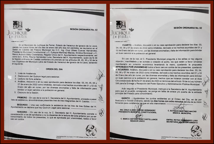Lo anterior fue aprobado en sesión de Cabildo donde por unanimidad se aprobó declarar como días inhábiles los días 3, 4, 5, 6 y 7 de enero derivado de los hechos ocurridos el 1 y 2 de este mes donde no dejaron suficiente información y la nula colaboración en el proceso de entrega-recepción.