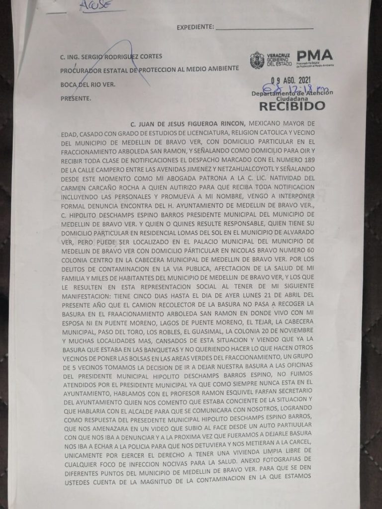 Vecinos de Medellín de Bravo denunciaron al alcalde de este municipio, Hipólito Deschamps Espino Barrios ante la Procuraduría estatal de Medio Ambiente por el problema ambiental que afecta a los habitantes de Medellín: que los camiones de la basura no pasan con frecuencia o sólo pasan por las calles principales de las colonias o fraccionamientos.