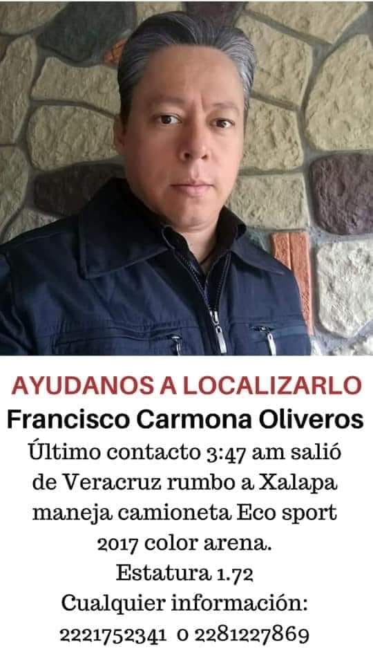 El último contacto que tuvo con su familia fue vía telefónica a las 3: 47 am, viajó de Veracruz a Xalapa. Manejaba una camioneta Eco Sport 2017, color arena. Familiares y amigos piden ayuda a través de las redes sociales para localizar a Francisco Carmona Oliveros.