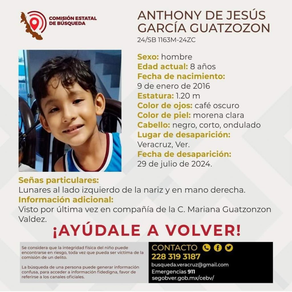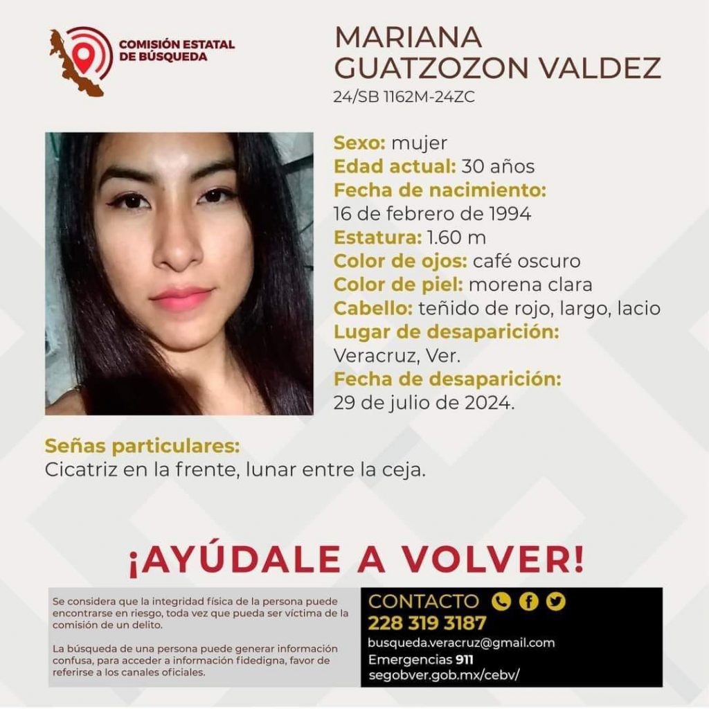 La Comisión Estatal de Búsqueda de Veracruz reportó la desaparición de Mariana Guatzozon Valdez de 30 años quien presuntamente iba acompañada de su menor hijo Anthony de Jesús García Guatzozon de 8 años cuando desaparecieron por lo que ambos son buscados. Mariana y Anthony de Jesús tienen tres días desaparecidos en la ciudad de Veracruz, por lo que la familia pide la ayuda de la población para dar con su paradero pues se desconocen las causas de la desaparición de Mariana y su hijo Anthony,