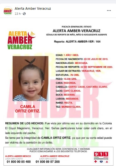 La niña Camila Ortiz Ortiz, de un año, un mes de edad, fue reportada como desaparecida en la ciudad de Veracruz.
