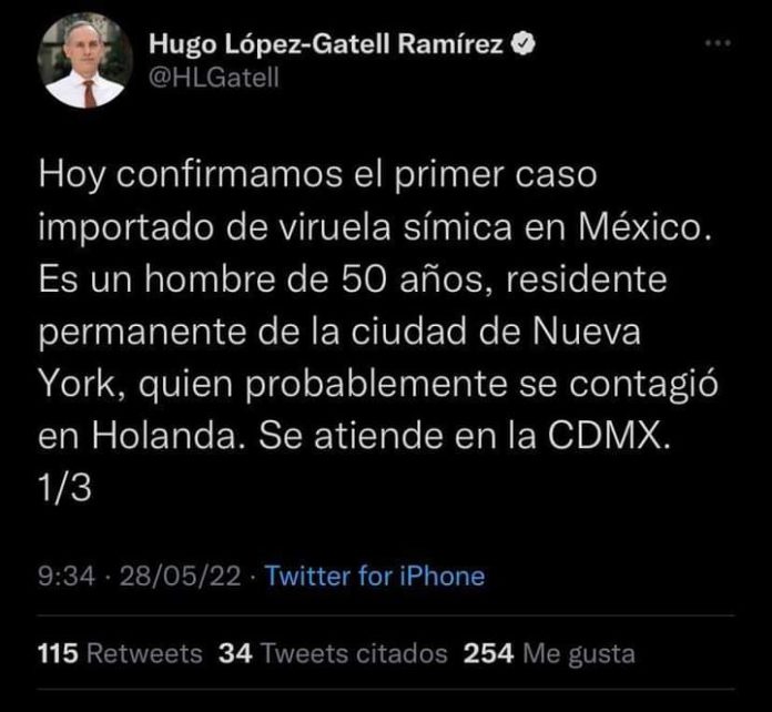 Ciudad de México, 28 de mayo de 2022 (proceso.com.mx).– El subsecretario de Salud, Hugo López-Gatell, confirmó este sábado la detección del primer caso importado de viruela símica en México.