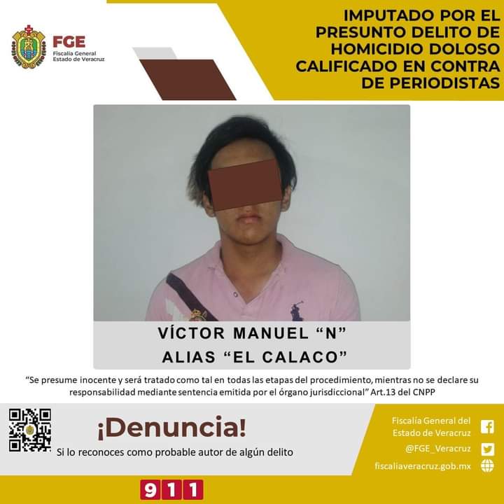 Xalapa, Ver.- Víctor Manuel N, alias “El Calaco”fue detenido e imputado por el presunto delito de homicidio doloso calificado cometido en agravio de la directora del portal El Veraz, Yessenia Mollinedo Falconi y la reportera Sheila Johana García Olivera, hechos suscitados el pasado 9 de mayo del presente año en el municipio de Cosoleacaque.