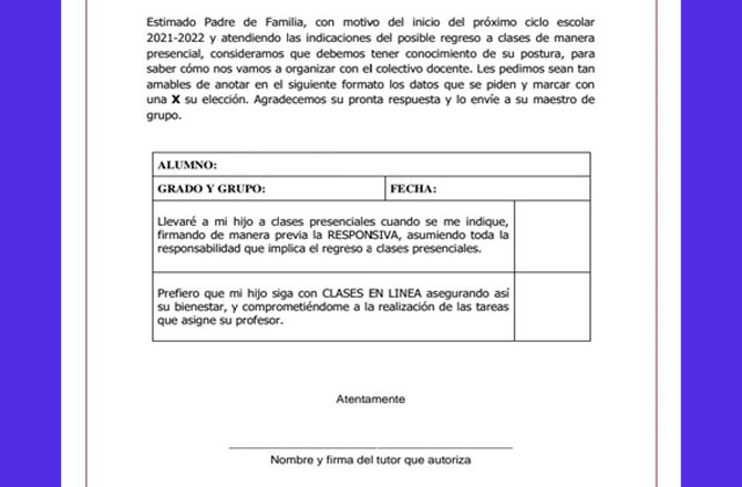 “Llevaré a mi hijo a clases presenciales cuando se me indique, firmando de manera previa la responsiva, asumiendo toda la responsabilidad que implica el regrese a clases presenciales”.