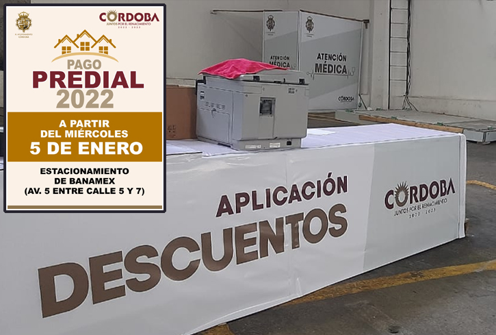 Córdoba, Ver.- Este miércoles 5 de enero iniciará el cobro del Impuesto Predial y Limpia Pública 2022, en las instalaciones del estacionamiento Banamex de la avenida 5 entre calles 5 y 7.