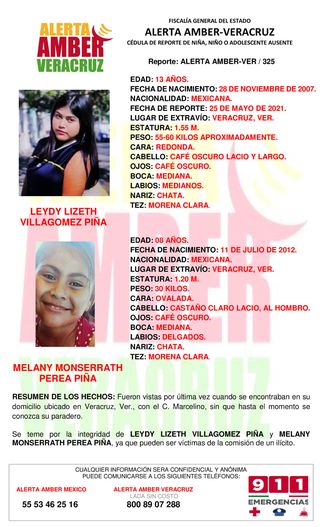 Por la desaparición de dos niñas en el puerto de Veracruz se emitió una Alerta Amber para que sean localizadas. Las niñas son: Leydi Lizeth Villagómez Piña de 13 años de edad, quien mide 1.55 metros,  es de tez morena clara, tiene la cara redonda, el cabello café oscuro, largo y lacio; tiene los labios medianos y la nariz chata.