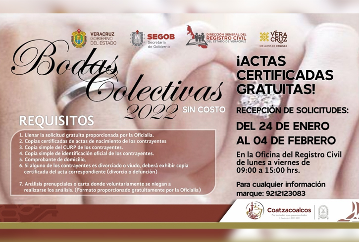 El ayuntamiento de Coatzacoalcos que preside Amado Cruz Malpica, a través de la oficialía del Registro Civil, realizará su programa anual de “Bodas Colectivas 2022” dirigido a las parejas que deseen contraer matrimonio de forma gratuita en el marco del 14 de febrero “Día del Amor y la Amistad”.