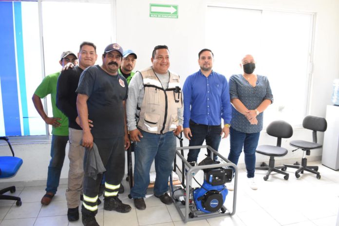 * El alcalde Marcos Isleño, en compañía de la regidora Karina del Carmen Arroniz, entregaron una motobomba y un contenedor.