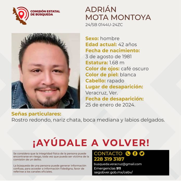 La Comisión Estatal de Búsqueda de Veracruz confirmó la desaparición de Adrián Mota Montoya, ex coordinador de delegaciones regionales de la secretaría de Educación de Veracruz.