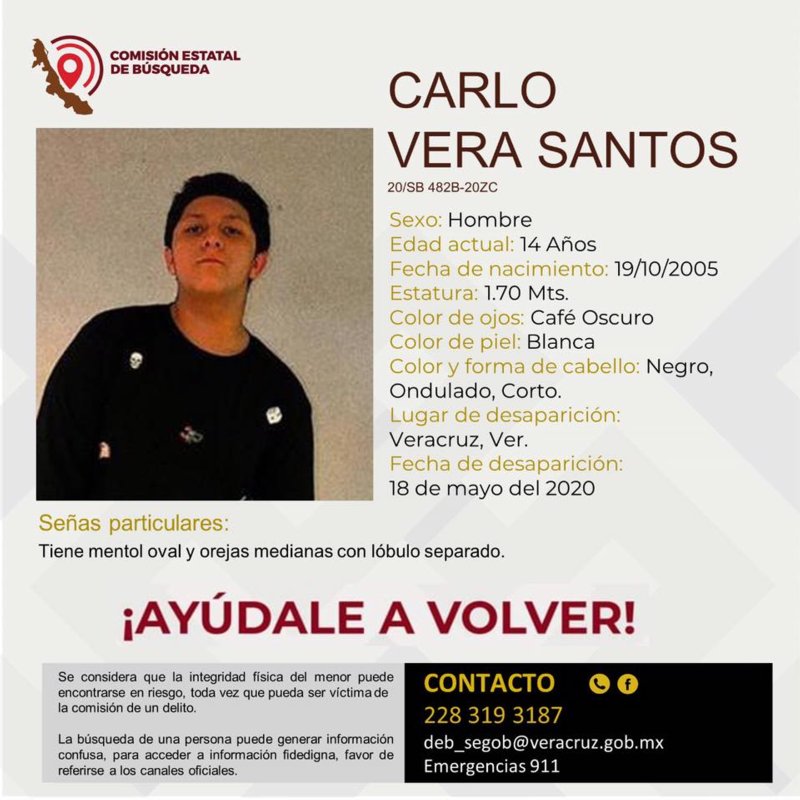 El otro desaparecido es Carlo Vera Santos, menor de edad de 14 años, mide 1.70 metros, es de piel blanca, cabello negro y ondulado. Tiene mentón oval y orejas medianas con lóbulo separado.