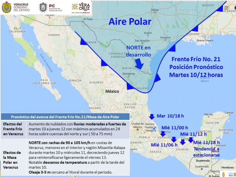 Evento de norte con rachas de 80 a 95 km/h en la costa y de 45 a 60km/h en la parte alta de Xalapa- Misantla y en el valle de Perote, oleaje elevado de 2 a 4 metros e inicio del descenso de la temperatura el lunes 10, siendo más notable el martes 11.