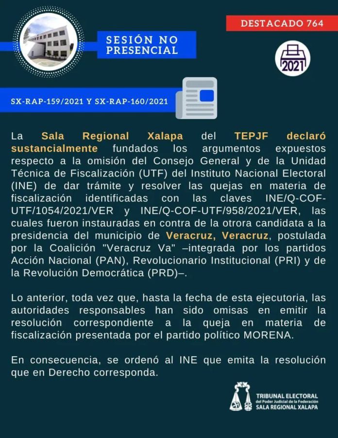 En tanto, la Sala Regional Xalapa del TEPJF declaró sustancialmente fundados los argumentos expuestos respecto a la omisión del Consejo General y de la Unidad Técnica de Fiscalización (UTF) del Instituto Nacional Electoral (INE) de dar trámite y resolver las quejas en materia de fiscalización, las cuales fueron instauradas en contra de la otrora candidata a la presidencia del municipio de Veracruz, postulada por la coalición “Veracruz Va” –integrada por los partidos Acción Nacional (PAN), Revolucionario Institucional (PRI) y de la Revolución Democrática (PRD)-.