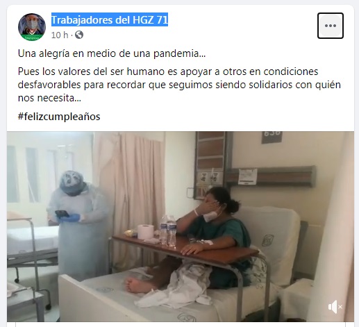 El acto de amor hacia la paciente fue compartido a través de las redes sociales por los trabajadores del IMSS acompañado del siguiente texto: “Esta tarde una paciente celebró su cumpleaños de una forma diferente, pero con el más sincero amor y satisfacción por parte del personal, quienes llevaron pastel a la cumpleañera, al mismo tiempo que le cantaban ´las mañanitas’”.