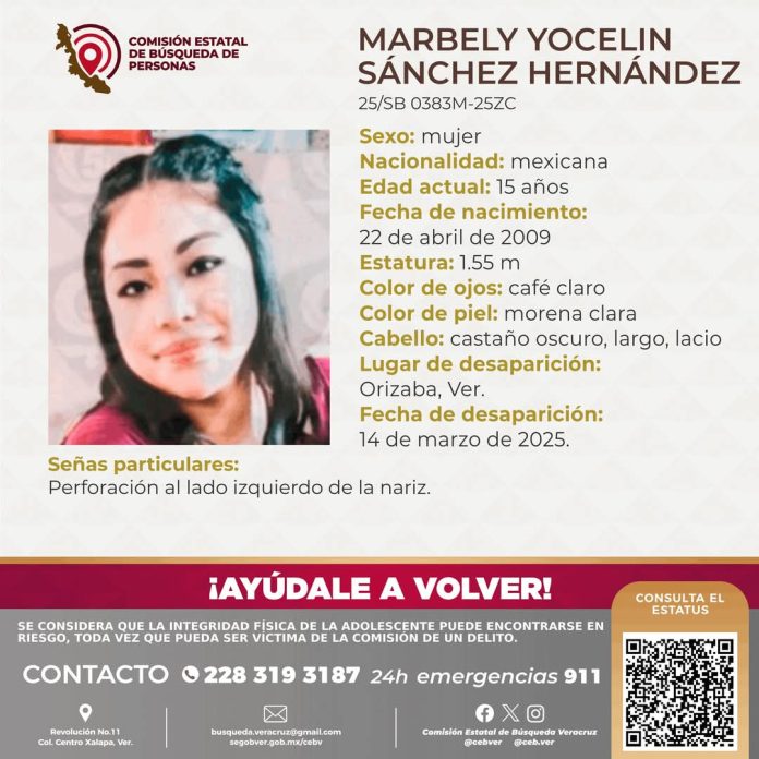 Marbely Yocelin Sánchez Hernández, de 15 años, desapareció en Orizaba y según la CEB mide 1.55 metros, tiene ojos color café claros, es de tez morena clara y tiene el cabello largo, lacio y castaño oscuro. Como seña particular tiene una perforación del lado izquierdo de la nariz.