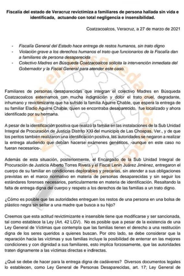 “Externamos con mucha indignación y dolor el trato cruel, degradante e inhumano que la fiscalía del Estado de Veracruz tiene con las víctimas”, expresó la activista quien escribió: