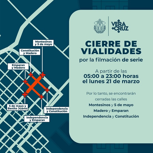 Veracruz, Ver.- El Ayuntamiento de Veracruz informa a los automovilistas sobre el cierre intermitente de vialidades en el Centro Histórico del Puerto por la filmación de una serie.