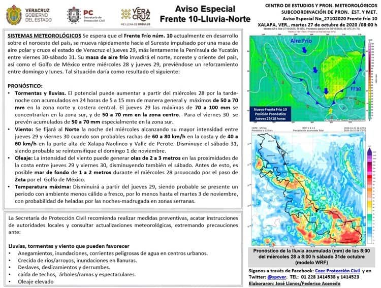 El Centro de Estudios y Pronósticos Meteorológicos de la Secretaria de Protección Civil emitió un aviso especial a los veracruzanos por el ingreso del Frente Frío número 10 que provocará lluvia y dos eventos de norte en el Estado de Veracruz.