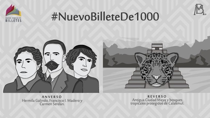 A través de sus redes sociales, Banxico dio a conocer que el nuevo billete de mil pesos será alusivo a la Revolución Mexicana y aparecerán en él Hermila Galindo, Francisco I. Madero y Carmen Serdán.