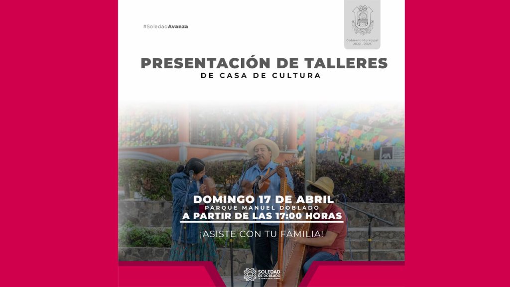 Como parte de las actividades preparadas para esta temporada vacacional, La Casa de Cultura de Soledad de Doblado te invita a la “PRESENTACIÓN DE TALLERES DE CASA DE CULTURA” con una amplio programa de actividades de grupos artísticos y musicales.