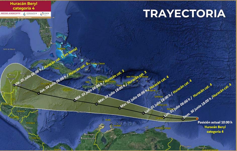 Hoy 30 junio el ciclón tropical Beryl se intensificó en categoría 4; conoce la trayectoria y el pronóstico del huracán Beryl de acuerdo del clima del Servicio Meteorológico Nacional (SMN).