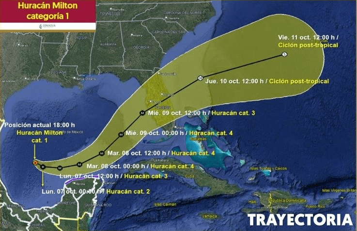 Ciudad de México.- Durante las siguientes horas, el huracán Milton, de categoría 1 en la escala Saffir-Simpson, mantendrá lluvias puntuales intensas (de 75 a 150 milímetros [mm]) en regiones de Veracruz; muy fuertes (de 50 a 75 mm) en zonas de Campeche, Quintana Roo, Tabasco y las costas de Tamaulipas y Yucatán, así como rachas de viento de 50 a 70 kilómetros por hora (km/h) y oleaje de 1 a 3 metros (m) de altura en los litorales de Campeche, Tabasco, Tamaulipas, Veracruz y el occidente de Yucatán.