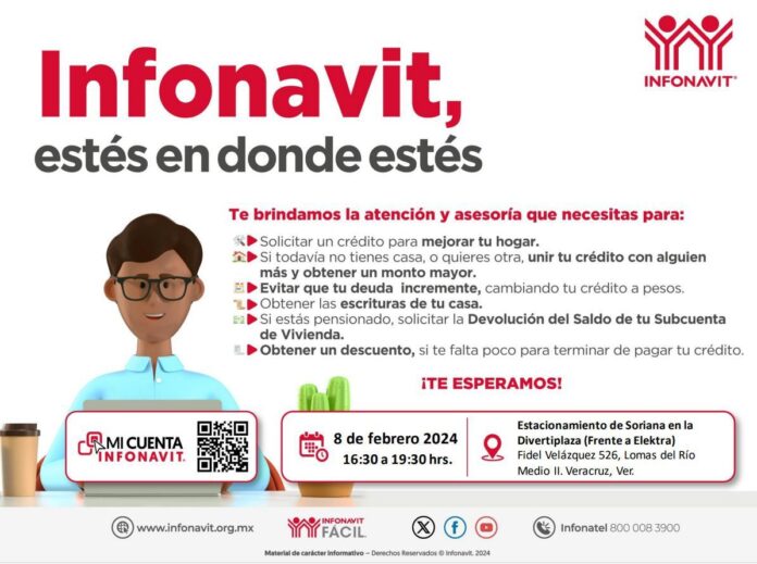 Veracruz, 07 de febrero de 2024.- El Instituto del Fondo Nacional de la Vivienda para los Trabajadores (Infonavit) iniciará las Brigadas de Promoción y Servicio, en la unidad habitacional Río Medio en Veracruz, para acercar su atención y productos a las personas, apoyándolas en la construcción de su patrimonio.