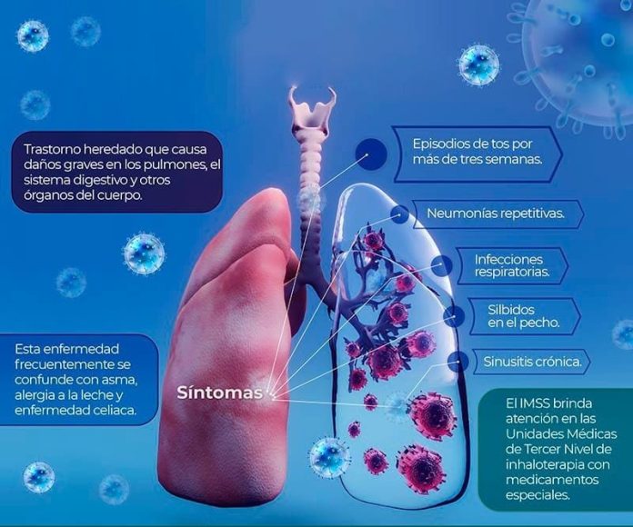 Mencionó que esta enfermedad es más común en niños y adultos jóvenes y se caracteriza por la formación de un moco anormal, más espeso y con cantidades de sales desequilibradas en el aparato respiratorio y digestivo, mismas que desencadenan una formación progresiva de tapones de mucosidad en las vías respiratorias que se infectan y deforman al pulmón en cavidades llamadas quistes, que terminan por destruirlo.