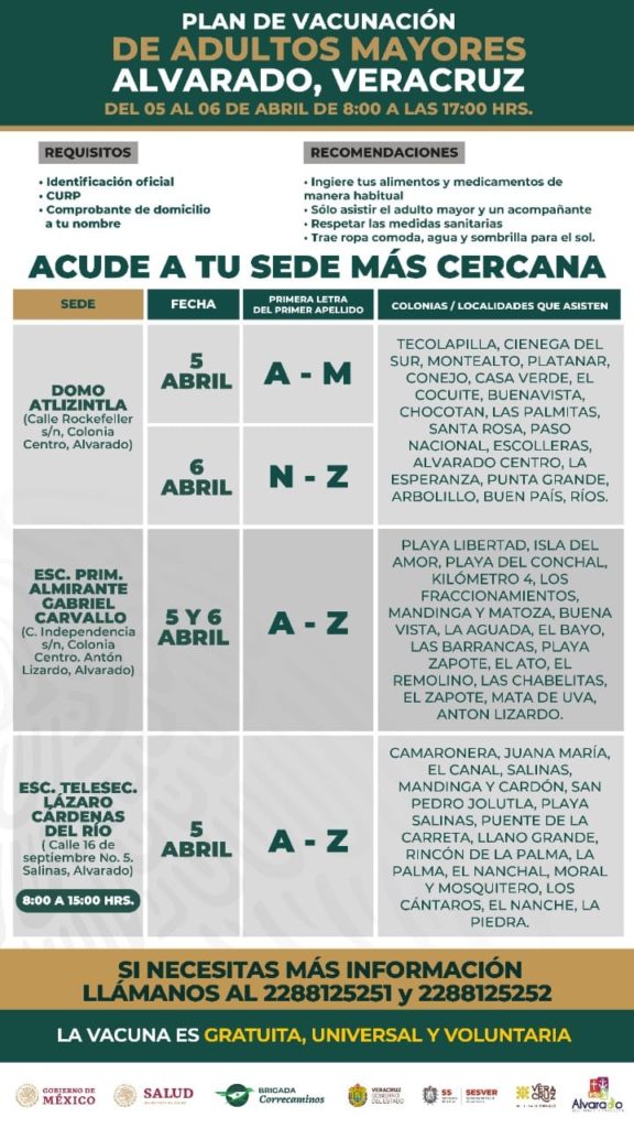 A través de sus redes sociales, el alcalde de Alvarado, Bogar Ruiz Rosas informó que este lunes 5 de abril inicia la aplicación de la primera dosis de la vacuna contra Covid-19 a adultos mayores de 60 años en el municipio de Alvarado.