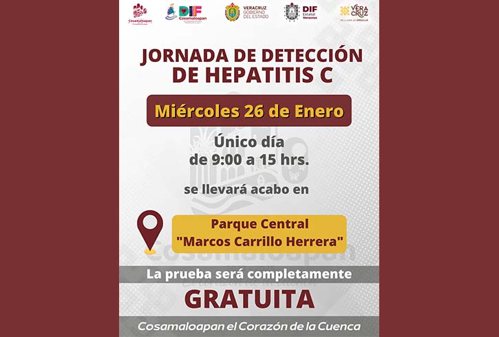 El H. Ayuntamiento de Cosamaloapan que encabeza Gustavo Sentíes Hernández, en coordinación con el DIF Municipal que preside Graciela Suárez, te invitan este miércoles 26 de enero a la jornada de salud de “Detección de hepatitis C”.
