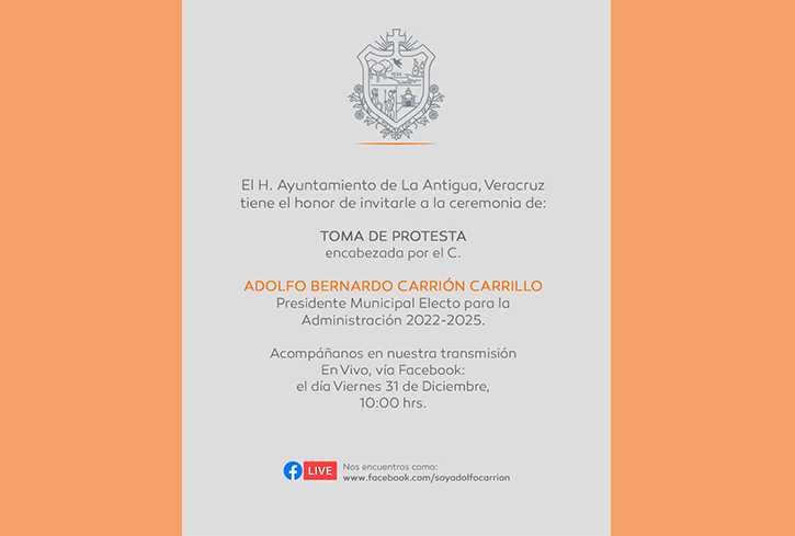 La Antigua, Ver.- ¡La Antigua tendrá el cambio que merece! Un gobierno cercano, honesto y que trabaje por lograr un bien común.Me siento honrado de poder compartir con ustedes la invitación a nuestra toma de protesta como cabildo de la administración 2022-2025, destacó Adolfo Bernardo Carrión Carrillo.