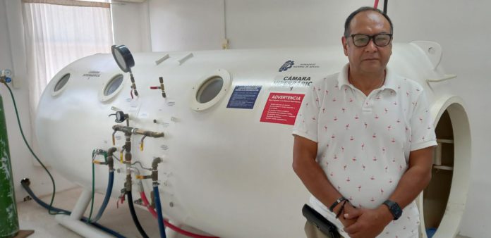 Y explica: “actualmente en el medio ambiente, el ser humano solo alcanza a recibir el 21 por ciento de oxigeno, es normal, a 1 de atmósfera de presión, al incrementarse esta fracción de oxigeno, por cambios de presión aumentamos la concentración y generalmente aumentamos la presión hasta 2.5 atmosferas absolutas de presión para lograr el beneficio”.