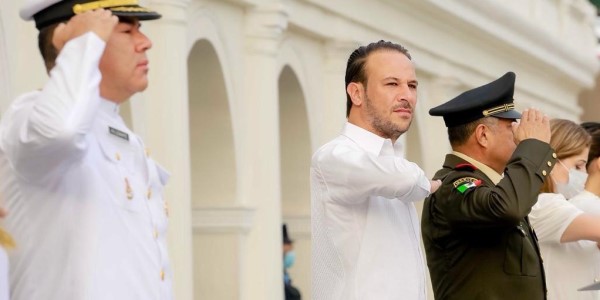 La plaza cívica Benito Juárez reunió a las autoridades municipales, navales y militares, donde enfatizaron el recordatorio de nunca olvidar que todos defendemos la misma bandera y la misma patria.