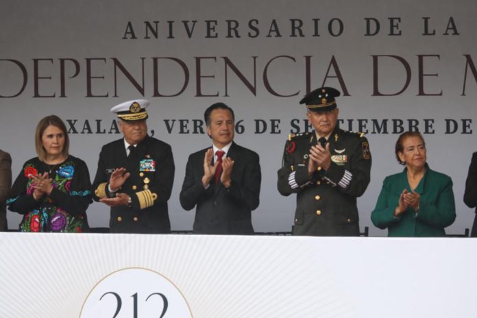 Desde el estrado principal frente a Plaza Lerdo, el gobernador Cuitláhuac García Jiménez saludó a las diversas tropas y disfrutó la demostración del equipo de combate al servicio de la nación, los vehículos, escoltas y estandartes del Ejército Mexicano, acompañado por el comandante de la 26/a Zona Militar, General José Francisco Camarena Hernández.
