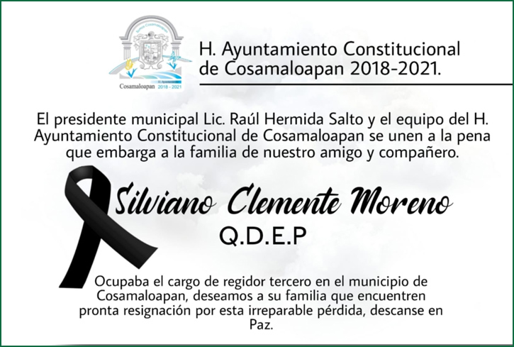 Cosamaloapan, Ver.- El Ayuntamiento que encabeza el Lic. Raúl Hermida Salto, expreso sus condolencia por el lamentable fallecimiento ocurrido este fin de semana de Silvano Clemente Moreno quien se desempeñaba como regidor tercera dentro de la actual administración.