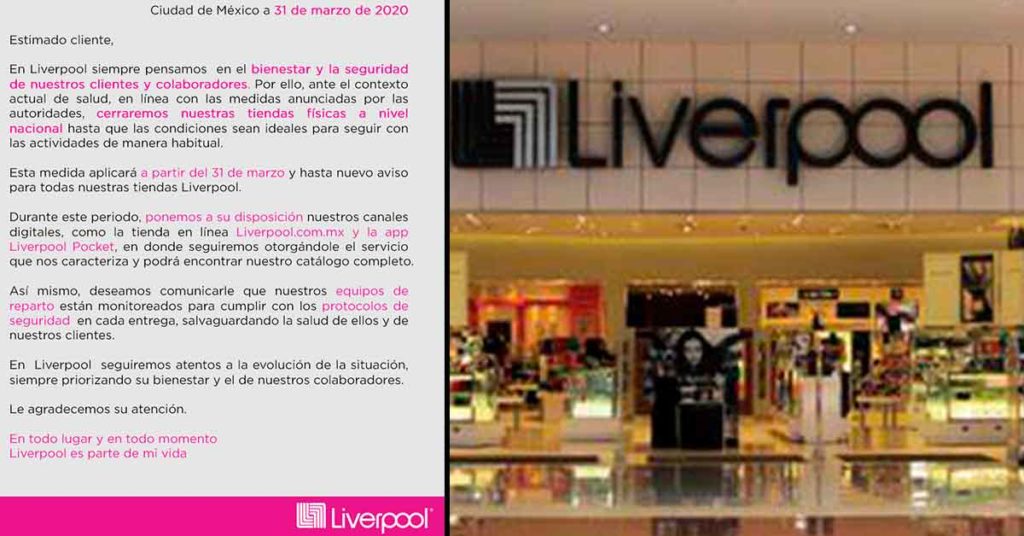 Ante la emergencia sanitaria en México por la pandemia de Covid-19, y atendiendo las medidas anunciadas por las autoridades de salud a nivel federal, Liverpool cerrará sus tiendas físicas a nivel nacional, pensando en el bienestar y la seguridad de sus clientes y colaboradores.