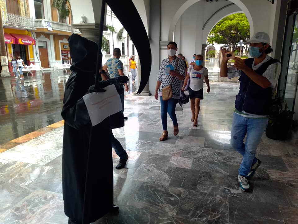 Después de que este jueves las autoridades del gobierno federal anunciaron que se superó la cifra de 50 mil muertes por Covid-19, un hombre con su disfraz de muerte recorrió las calles del centro del puerto de Veracruz para concientizar a la población del uso de cubrebocas.