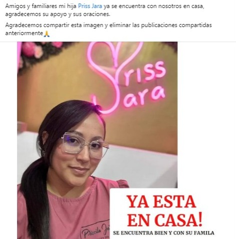 “Amigos y familiares mi hija Priss Jara ya se encuentra con nosotros en casa, agradecemos su apoyo y sus oraciones”, se lee en el perfil de Mafy Jara, quien agradeció a las personas que compartieron las imágenes de su hija para dar con su paradero.