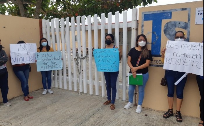 Con pancartas que decían “No a la violencia” y “Los maestros merecen respeto”, relataron que el pasado 3 de marzo, una madre agredió físicamente al profesor del primero “B”, pues éste le habría quitado el celular a su hijo.