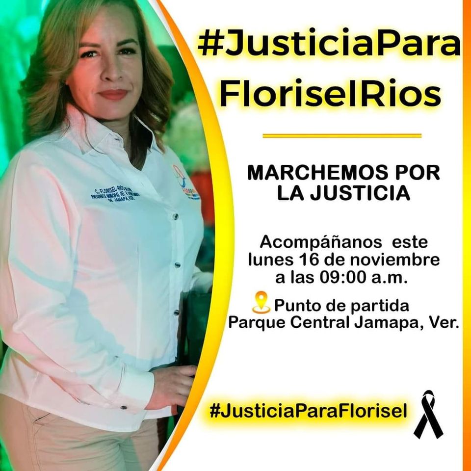 A través de las redes sociales se anunció que este lunes 16 de noviembre a las 9:00 de la mañana en el parque central de Jamapa, Veracruz se llevará a cabo una marcha para exigir justicia por el asesinato de la alcaldesa de Jamapa, Florisel Ríos Delfín, trágico suceso que se registró la mañana del miércoles 11 de noviembre y que esperan se esclarezca.