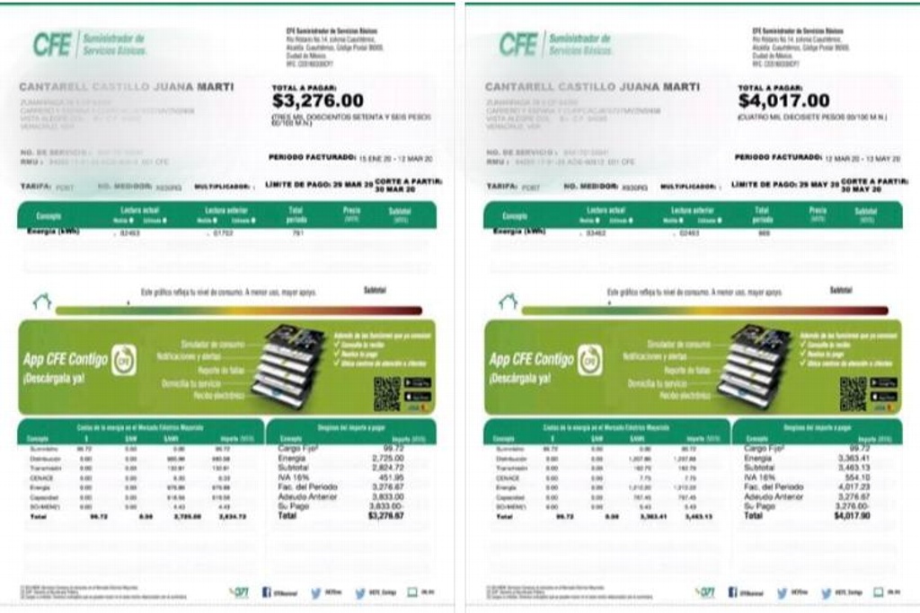 A continuación transcribimos lo que escribió su su facebook Maritza Cantarell: “El primero es el recibo de la luz en mi negocio del periodo anterior y el segundo es el recibo que me acaba de llegar. Lo que me tiene impactada es que este periodo tuve cerrado el local por 4 semanas, sin uso de clima, sin uso de luz, es más antes de cerrarlo desconecté hasta el refrigerador ¿cómo puede ser posible?