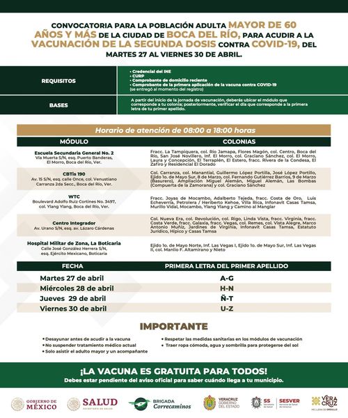 La jornada de vacunación de los adultos mayores de Boca del Río será del 27 al 30 de abril en orden alfabético. El 27 comienza con las personas cuyo primer apellido empiece con las letras A a la G; el miércoles 28 con las personas cuyo primer apellido comience con las letras H a la N; el jueves 29 de la letra Ñ a la T y de la U a la Z el 30 de abril.