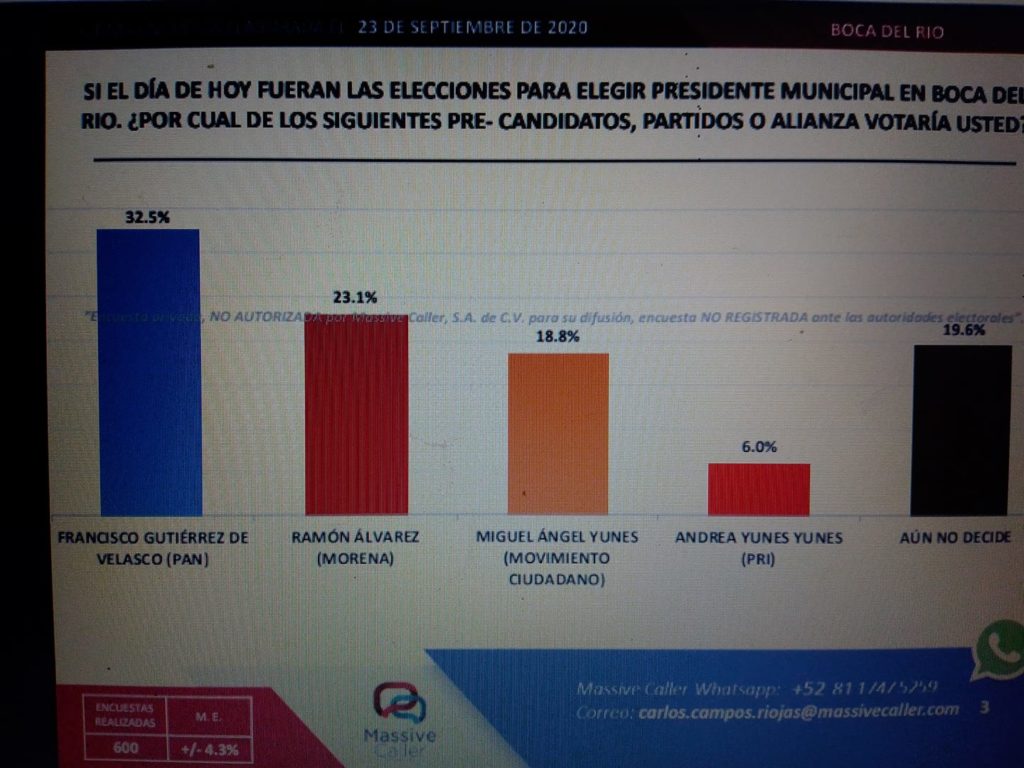 A través de esta encuesta se pudo apreciar que si hoy fueran las elecciones de alcalde en Boca del Río, el Partido Acción Nacional obtendría el triunfo con un 32.5 por ciento si Francisco Gutiérrez de Velasco Urtaza encabezara la candidatura. En la encuesta aparece Miguel Ángel Yunes Márquez como candidato a la alcaldía de Boca del Río por el partido Movimiento Ciudadano, el cual obtendría un 18.8 por ciento. Aunque la posibilidad de que Miguel Ángel sea candidato por tercera ocasión a la alcaldía de Boca del Río es nula, pues se rumora que él podría ser candidato a la presidencia municipal de Veracruz, ya que los yunistas no quieren perder ese municipio y consideran que la carta fuerte con la que cuentan para darle batalla a los morenos es Yunes Márquez.