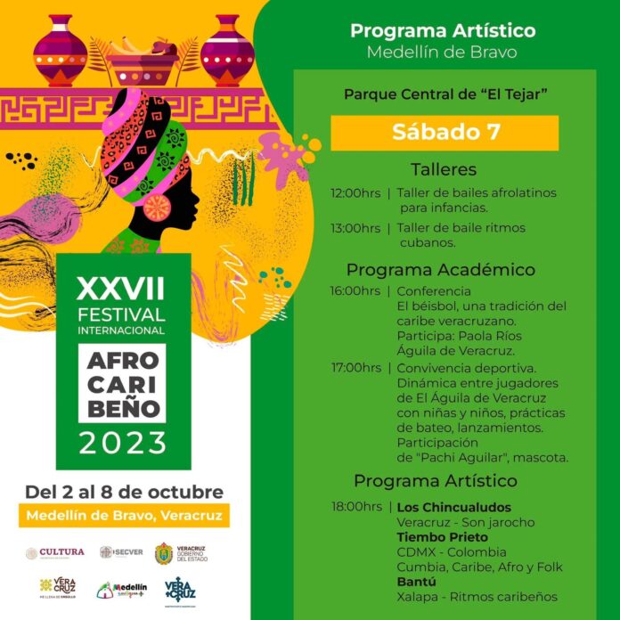 Medellín de Bravo, Ver. 05 de octubre de 2023.- Con la participación de artistas nacionales e internacionales, el Ayuntamiento que encabeza el Alcalde Marcos Isleño Andrade y el Instituto Veracruzano de la Cultura (IVEC) invitan a la vigésimo séptima edición del festival “Afrocaribeño” que tendrá como sede el Parque Central de la localidad de El Tejar, los días 7 y 8 de octubre.