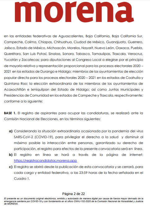 El Comité Ejecutivo Nacional de Morena emitió la convocatoria  los procesos internos para la selección de candidaturas para: diputaciones al Congreso Local a elegirse por el principio de mayoría relativa y representación proporcional1; y miembros de los ayuntamientos de elección popular directa y, en su caso, miembros de las alcaldías y concejalías para los procesos electorales 2020 – 2021.