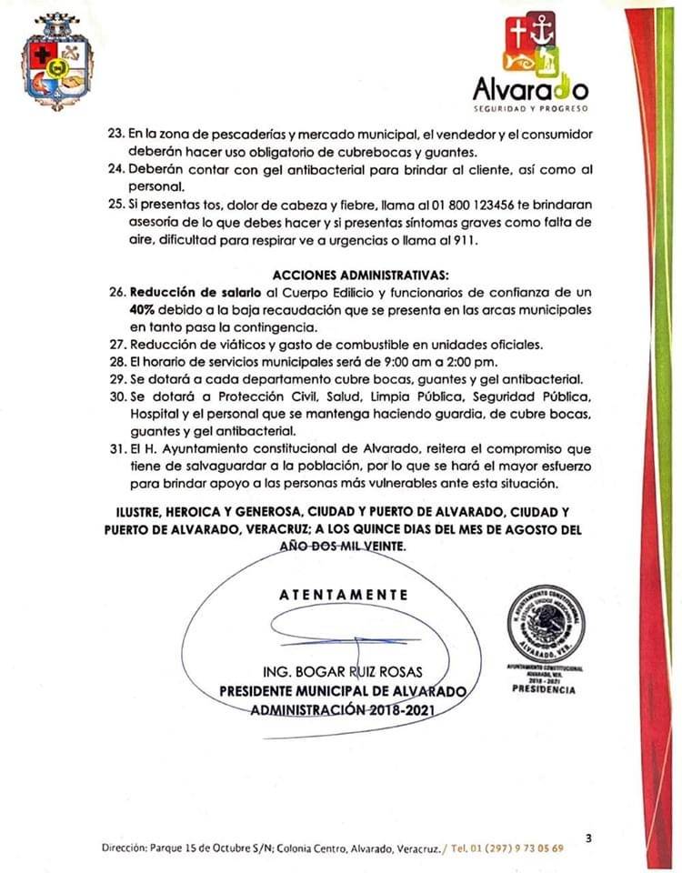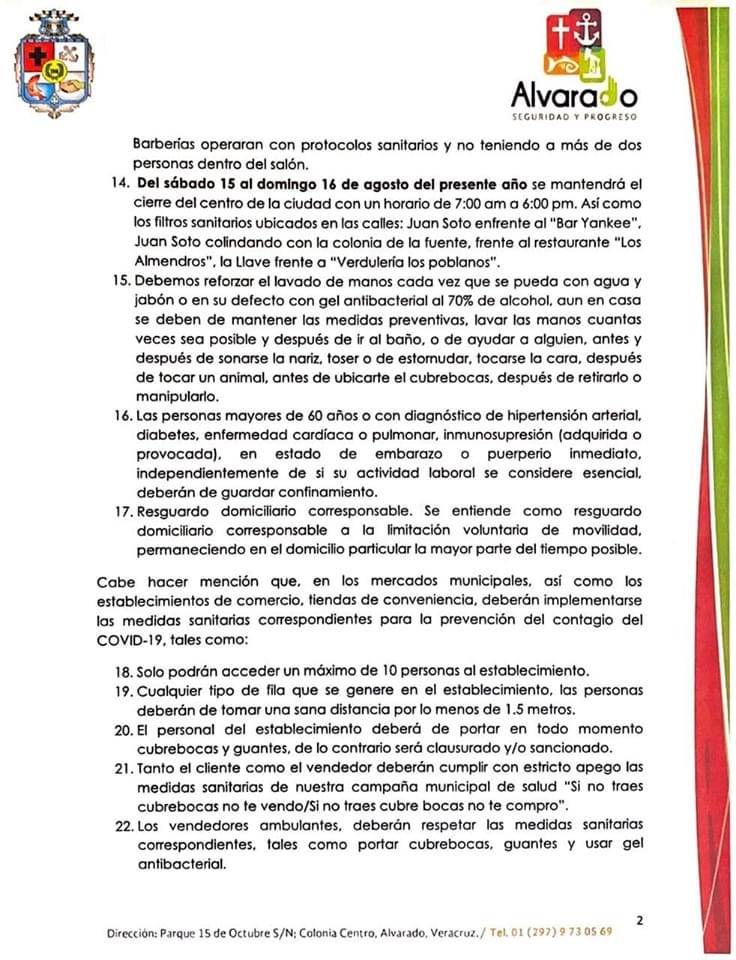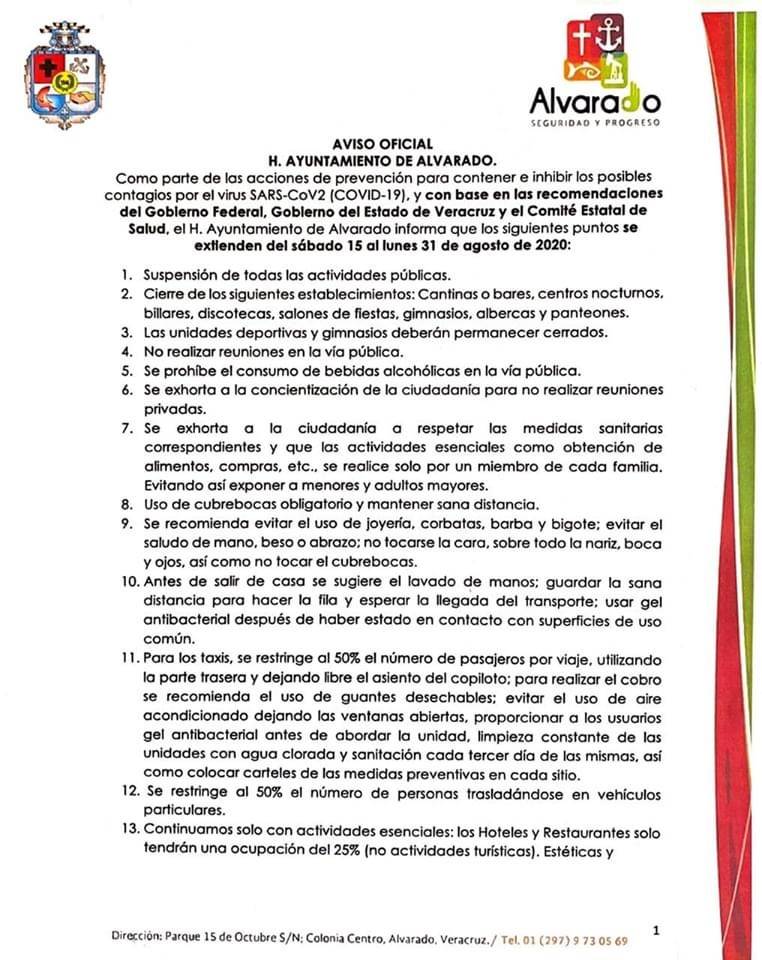 Como parte de las acciones de prevención para contener e inhibir los posibles contagios de COVID-19, y con base en las recomendaciones del Gobierno Federal, Gobierno del Estado de Veracruz y el Comité Estatal de Salud, el Ayuntamiento de Alvarado dio a conocer 31 puntos importantes que se extienden del 15 al 31 de agosto de 2020.
