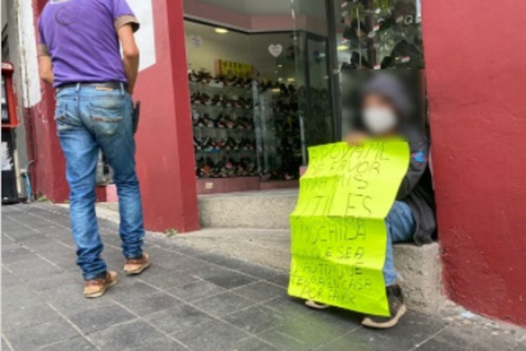 Un menor de edad se instaló en la vía pública con una cartulina en mano para pedir el apoyo económico a los transeúntes, ante la carencia de su familia en la adquisición de útiles escolares, uniforme y mochila para este regresos a clases.