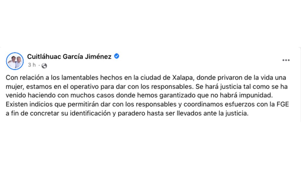En sus redes sociales el mandatario veracruzano publicó: Con relación a los lamentables hechos en la ciudad de Xalapa, donde privaron de la vida una mujer, estamos en el operativo para dar con los responsables. Se hará justicia tal como se ha venido haciendo con muchos casos donde hemos garantizado que no habrá impunidad. Existen indicios que permitirán dar con los responsables y coordinamos esfuerzos con la FGE a fin de concretar su identificación y paradero hasta ser llevados ante la justicia.