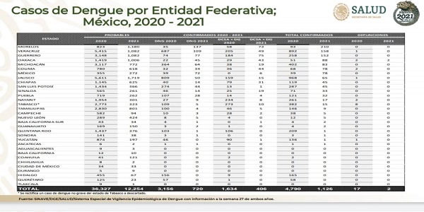 El estado de Morelos ocupa el primer lugar con 210 casos confirmados de dengue; Veracruz, 158; Guerrero, 152; Oaxaca, 88; Michoacán, 83. Estos estados representan el 61 por ciento del total de casos confirmados en el país.