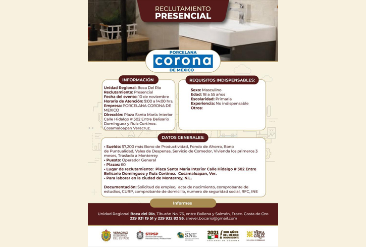 Con la finalidad de otorgar las herramientas de oportunidad para todos y todas, a través del Servicio Nacional de Empleo Veracruz (SNEVER) y la Secretaría de Trabajo, Previsión Social y Productividad Veracruz te invitamos al reclutamiento presencial, ofreciendo 60 plazas de Operador General en #Cosamaloapan para trabajar en #Monterrey.