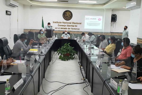 Veracruz, Ver., 07 de junio de 2022.- La 04 Junta Distrital Ejecutiva del Instituto Nacional Electoral llevó a cabo un evento de análisis mediante una Mesa de discusión sobre el proceso de integración de las mesas directivas de casilla y las tres modalidades de capacitación (presencial, a distancia y virtual) recibidas por Supervisores Electorales y Capacitadores Asistentes Electorales durante el Proceso Electoral 2020-2021, con el fin de transparentar sus resultados, identificar las buenas prácticas y áreas de oportunidad, para contar con una perspectiva de innovación.